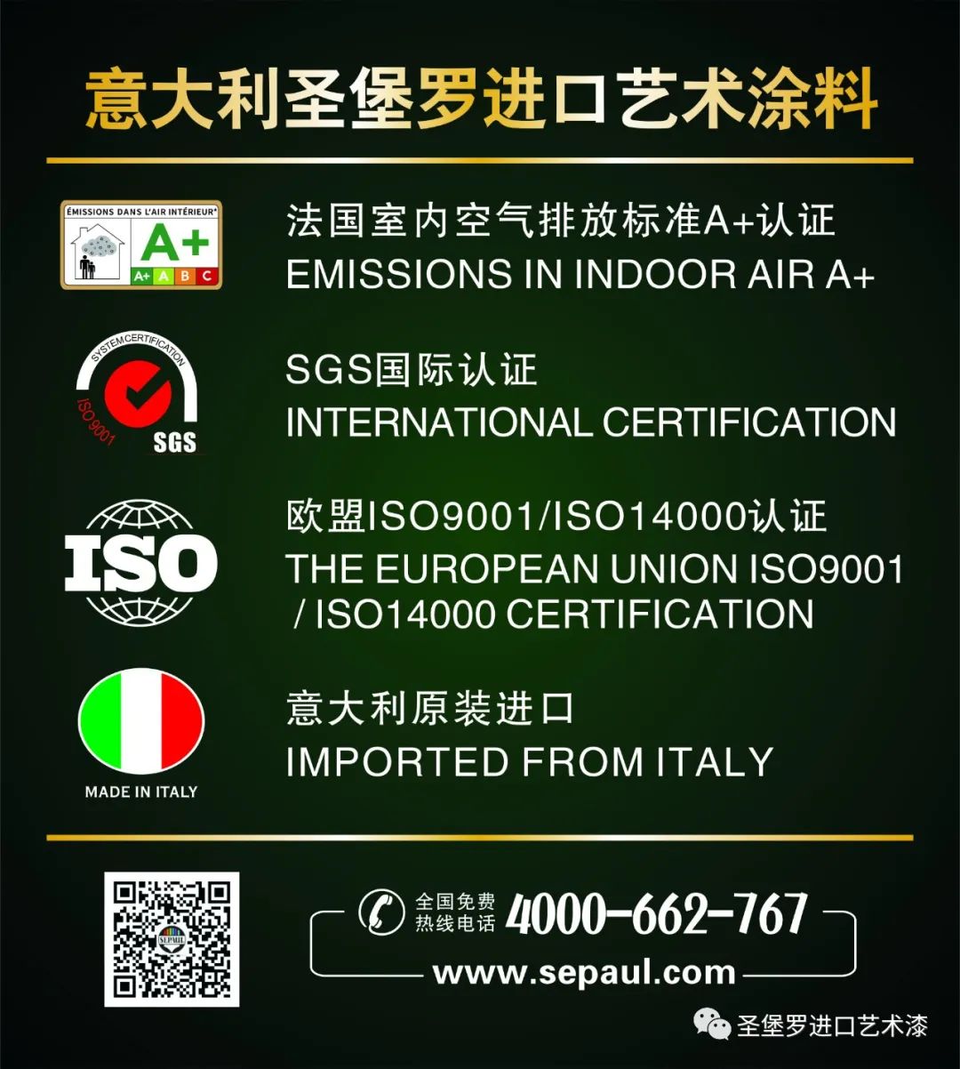 SEPAUL圣堡罗进口艺术涂料以高端价值、空间的搭配、艺术的多样性能以及可定制性等优势,是一款绿色环保,不含有机物挥发物、游离甲醛和重金属等有害元素。同时,可有效降解空气中的有害物质,制造出清新宜人的良好空气环境。产品获得法国A+认证,并通过国际SGS环保检测,符合欧盟RoHS要求,值得信赖。