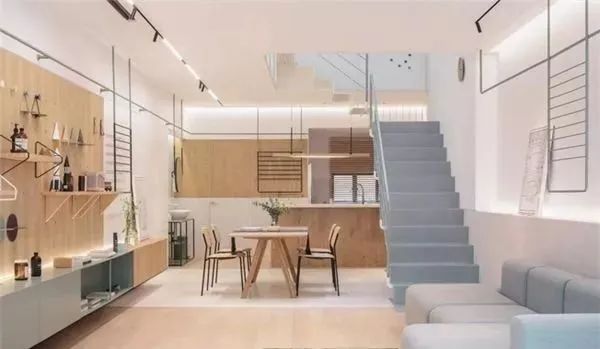 若你是配色高手的话,且对自己的审美非常有自信的话。那么给家里用一些新颖、不常见的颜色作为主配色,将能让你家环境变得更加突出,将木地板直接延伸到墙面当中,小巧的储物柜和地板之间只有一丢丢的距离,然后漆上了今年最流行的鼠尾草绿非常吸引眼球吧。换个角度,楼梯、沙发的颜色也是和柜子基本一致,也都在25%的主配色的范围内,让整个空间看起来非常舒服。