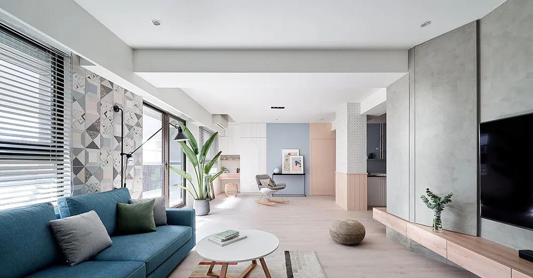 它饱和度不高,不鲜亮,不张扬,使得空间柔和自然舒缓雅致