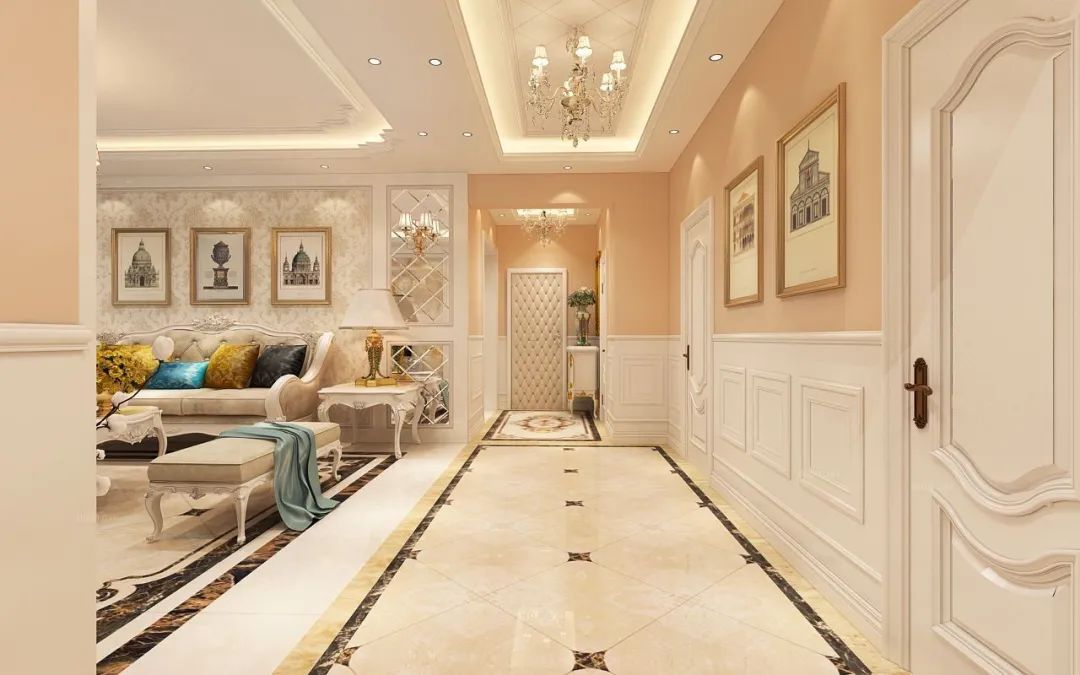欧式简约风格整体色彩搭配以暖色系为主,比如:米黄色、浅奶咖,浅灰蓝,搭配色有:白色、象牙白、乳白色,整个空间显示华丽、温馨之感,主次分明,让整个空间色调更加高雅、和谐。